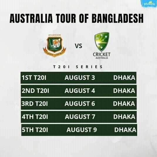 ৫ ম্যাচ টি-টুয়েন্টি সিরিজ খেলতে অস্ট্রেলিয়া এখন বাংলাদেশে।৩ ও ৪ তারিখ দুইটি টি-টুয়ান্টি এরপর ৫ তারিখ ব্রেক নেয়ার পর ৬, ৭ তারিখ দুইটি টি-টোয়েন্টি এরপর সর্বশেষ টি-২০ এ মাসের নয় তারিখ।